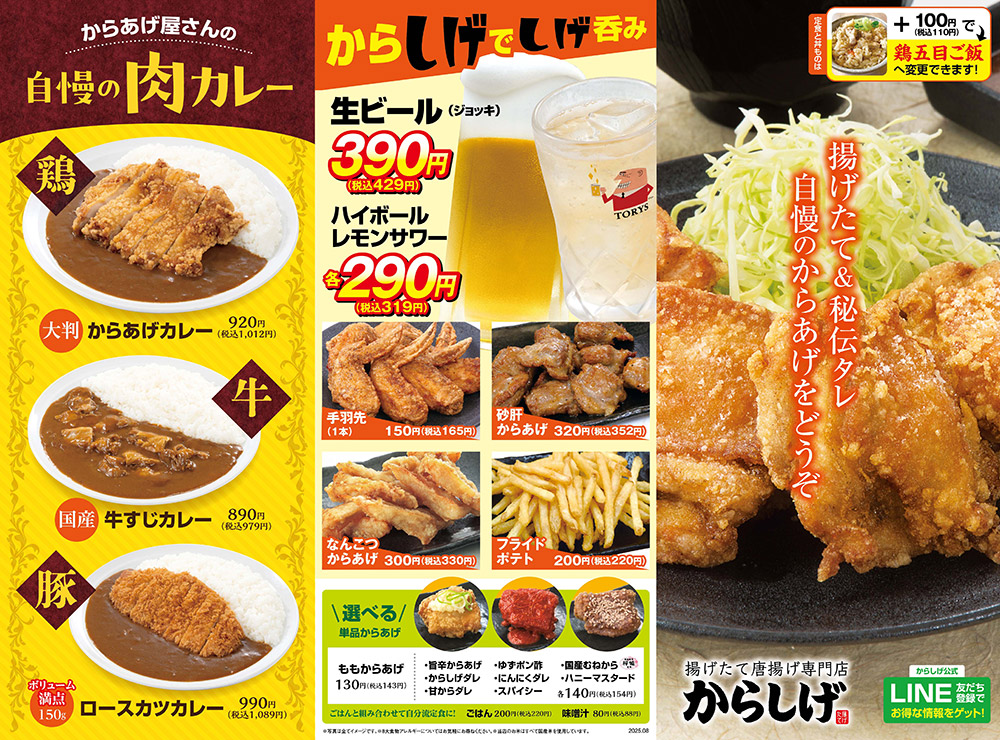 からあげ専門店「からしげ」の こだわりは、ジューシーな鶏肉と秘伝の特製タレにあります。外はカラリと、中はジューシーになる様一つ一つ丁寧に揚げてます。お客様にアツアツ揚げたてを食べて頂きたく、常に揚げたてをご提供いたします!